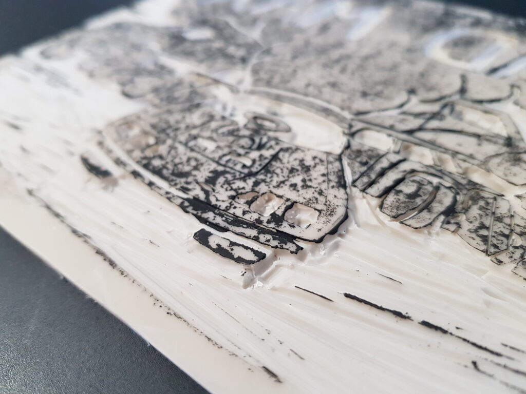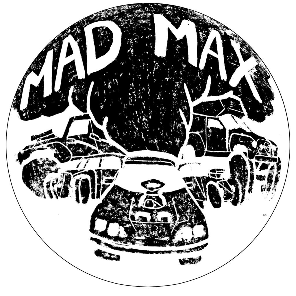 Da das händische Schnitzen des Linoldrucks grob ist, habe ich mich für ein Mad Max Thema entschieden.
